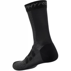 The S-PHYRE Tall Socks offer pro-level performance, especially when combined with Shimano’s S-PHYRE road shoes, with the pattern on the calf providing an aerodynamic advantage and the anti-slip heel ensuring a lock-in feel. Comfort is equally well catered for, as the socks have a seamless toe box, cushion rib knitting over the foot and a ventilated sole for better temperature regulation. The thinner bottom knit area gives a great feel through the pedals.Â